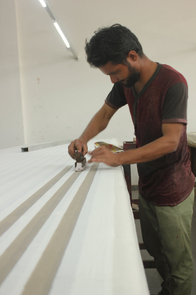 BLOCK PRINTING is the most ancient and simplest technique of printing on textile. The design is carved into a teak or ebony wood block, for more complex designs also in metal blocks. After dipping the block into colour sieve covered by jute the block is pressed on the fabric. It is a slow process that needs a lot of time, precision and patience.